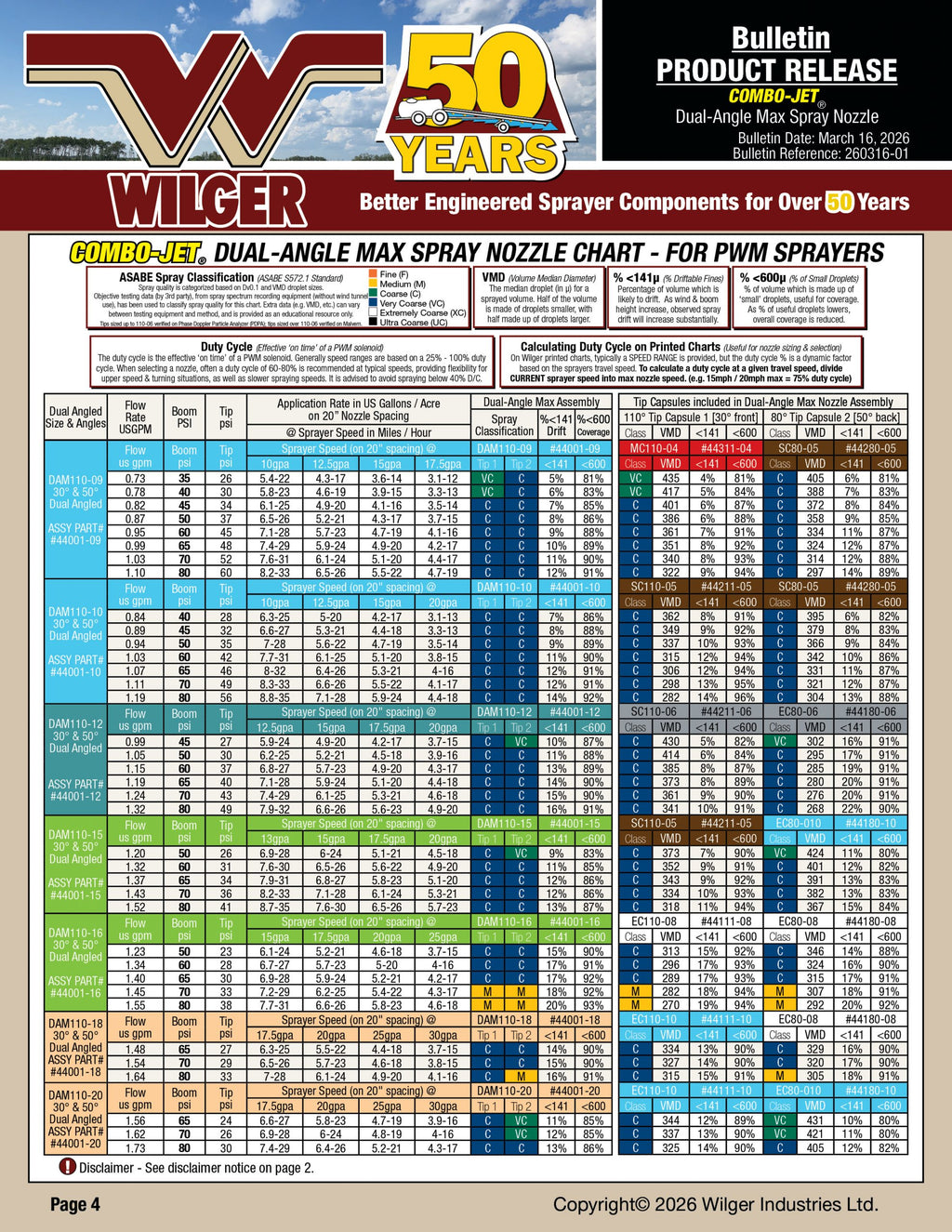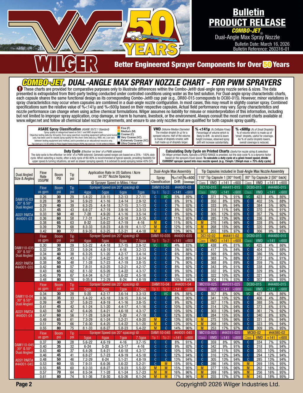 If you are familiar with Wilger nozzle charts, the DAM110 series is design to maintain coverage factor (%<600µ) of 90% or higher, even for high rate applications like fungicides.