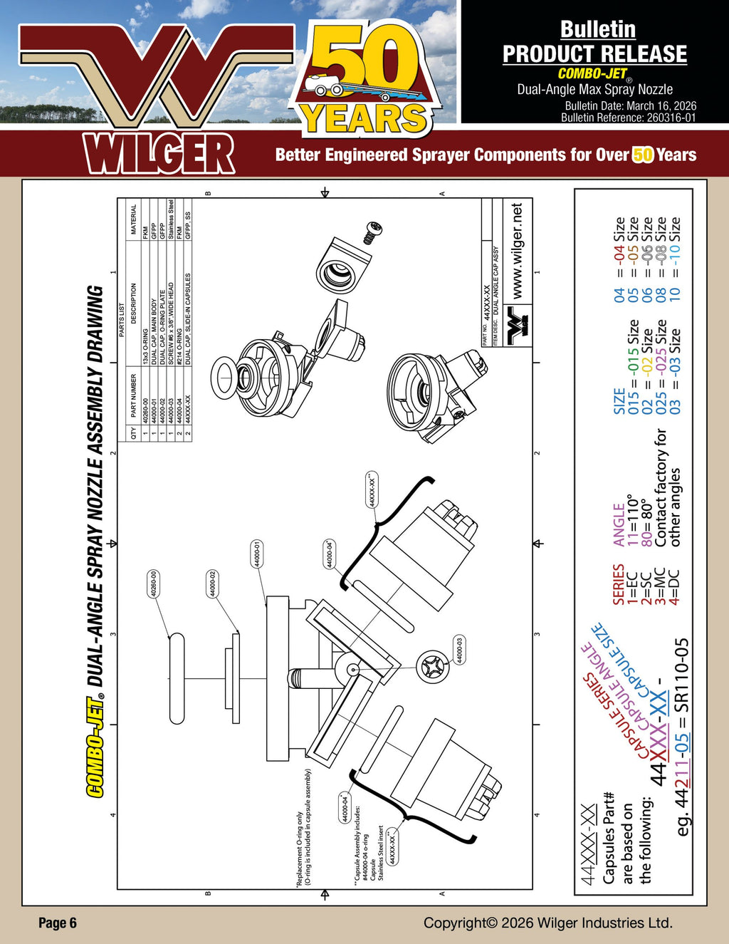 One of Wilger’s key goals is to empower spray applicators to improve how they spray. Often this meant using adapters made by Wilger to change HOW we spray (e.g. using double-down adapters, or angled adapters). With that core vision in mind, we also ensure spray applicators can customize their Dual-Angle MAX spray nozzles as well. The dual-cap can be dissassembled and the capsules swapped with other series (using the same COMBO-JET series and sizes in dual-cap capsule form), or a user can buy the #44000-00 dual-cap kit as well as the two nozzle capsules (based on normal ER/SR/MR/DR and 80°/110° and size format).